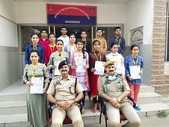 Akhnoor: function was organized by Akhnoor police, where the 14 toppers namely Divyansh Nagyal, Khushi Mahajan, Abhinandan Verma, Adil Sharma, Bhoomi Bhardwaj, Kashish Sharma, Akarshit Bargotra, Sonia Sharma, Payal Sharma, Bharat Rajput, Rakhi Khajuria, Riya Sharma, Chinta Sharma and Nikita Sharma of 12th class result of which was declared recently by J&K Board of School Education and secured more than 90 % marks, belonging to the adjoining schools of police sub division Akhnoor were called and given appreciation letters and medals on behalf of J&K police by SDPO Akhnoor, Sh. Ajay Sharma, KPS in presence of SHO PS Akhnoor, Inspr. Pardeep Sharma, other respectables of the town.Â