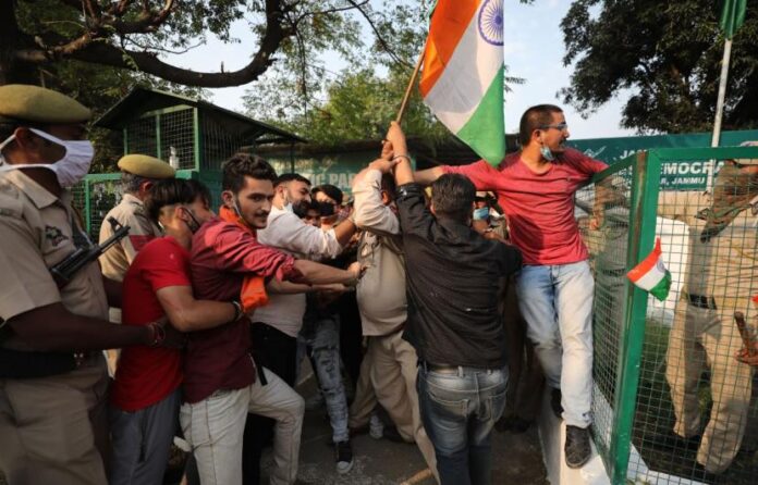 They said the slogan-shouting protesters made repeated attempts to enter the building and hoist the tricolour but were initially stopped by police personnel who took several of them into preventive custody briefly.