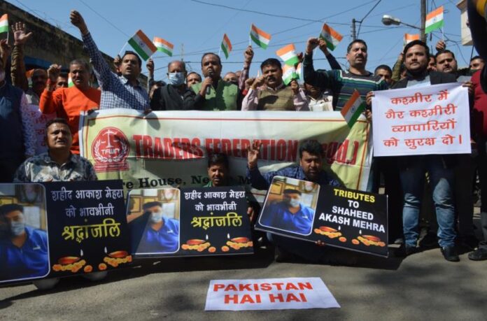JAMMU: Protesting the recent killing of an eatery owner’s son in Srinagar, a group of traders staged a protest here on Wednesday and demanded safety and security of the non-local businessmen working in the Kashmir valley.