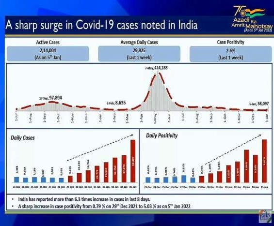 “India has reported a more than 6.3 times increase in cases in the last eight days. A sharp increase was seen in case positivity from 0.79 per cent on December 29, 2021 to 5.03 per cent on January 5,” Joint Secretary of Health Ministry, Lav Agrawal said during a briefing of the ministry.