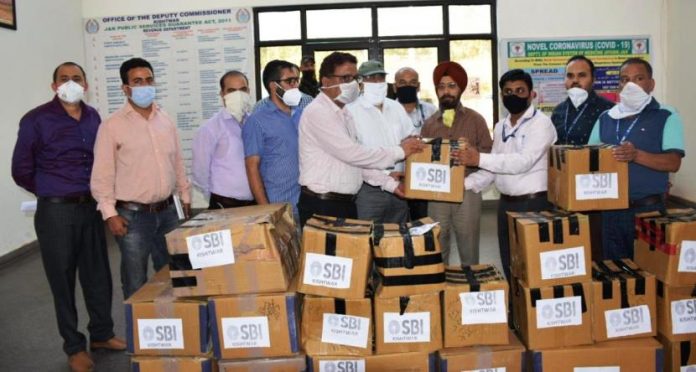 Chief Manager SBI Kishtwar handed over the safety material to DDC Kishtwar for further distribution among the Frontline workers who are dealing with the COVID-19 positive persons, officers/Officials working in quarantine centres 24×7 and others.